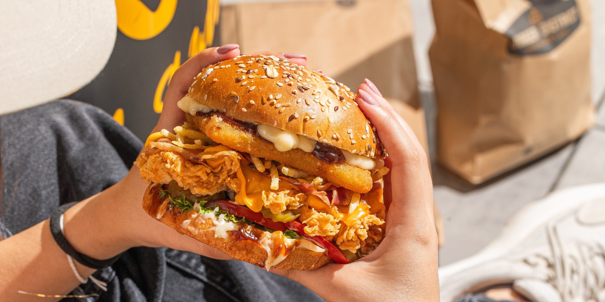 BURGER DISTRICT SPECIAL Two crispy chicken, two layers of cheddar cheese, crispy bacon, lettuce, tomato,